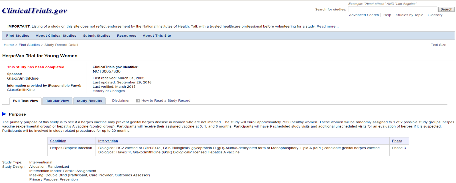 ここで、ちょっと HerpVac の情報を Trial.org で調べてみると…、調査するワクチンに関しては、